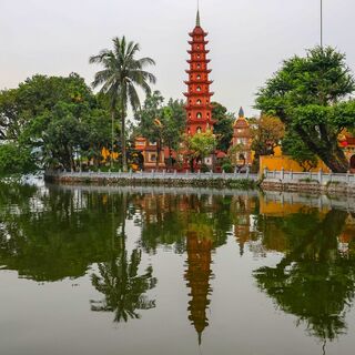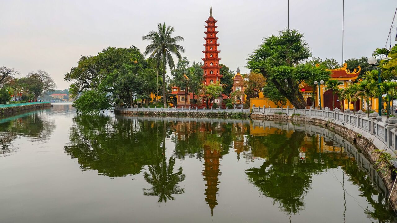 Начинаем знакомство с Ханоем с посещения самого древнего храма – пагоды Чан Куок (Chùa Trấn Quốc), которая возвышается над озером Хо Тай (Hồ Tây). Пагода была возведена в VI веке нашей эры и изначально она находилась в другом месте, там где озеро Хо Тай смыкается с Красной рекой. Где она простояла более 1000 лет. Из-за разрушающегося берега реки пагода была перемещена на нынешнее место в начале XVII века.
