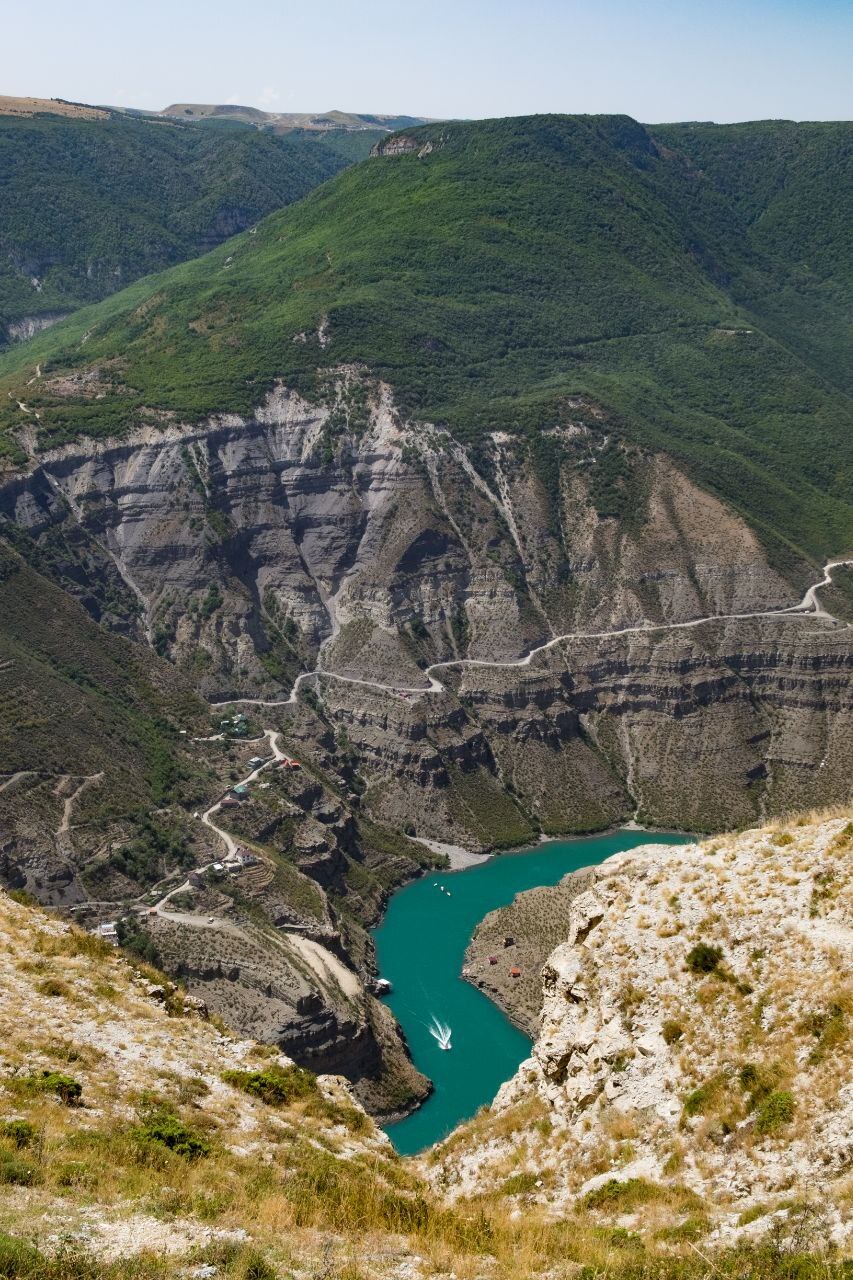 Знаменитая зелёная ленточка Сулакского каньона, извиваясь между тесных скал, сверкая на солнце несет свои воды от плотины Чиркейской ГЭС до Миатлинской плотины.
